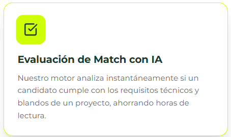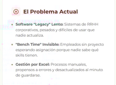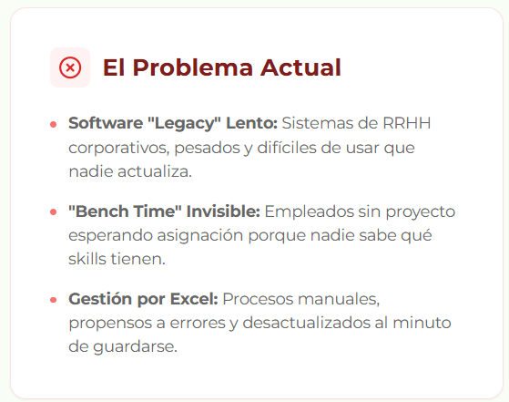 El primer Marketplace de Talento Interno diseñado para consultoras y empresas medianas en Latinoamérica. Reduce costos de contratación un 35% y elimina el "bench time" de tus equipos.