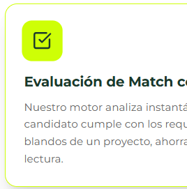 Considera experiencia técnica, soft skills y trayectoria profesional para calcular la compatibilidad.