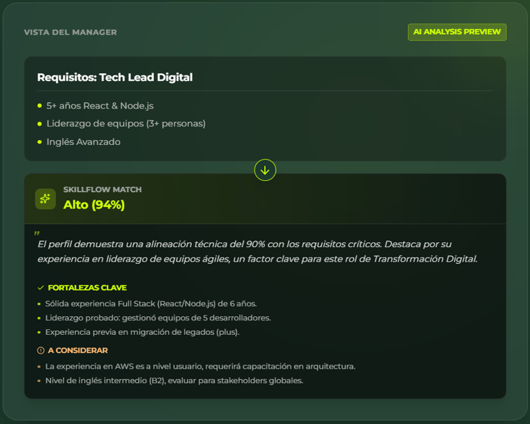 Genera explicaciones claras de por qué un candidato es el indicado, facilitando la decisión del manager.